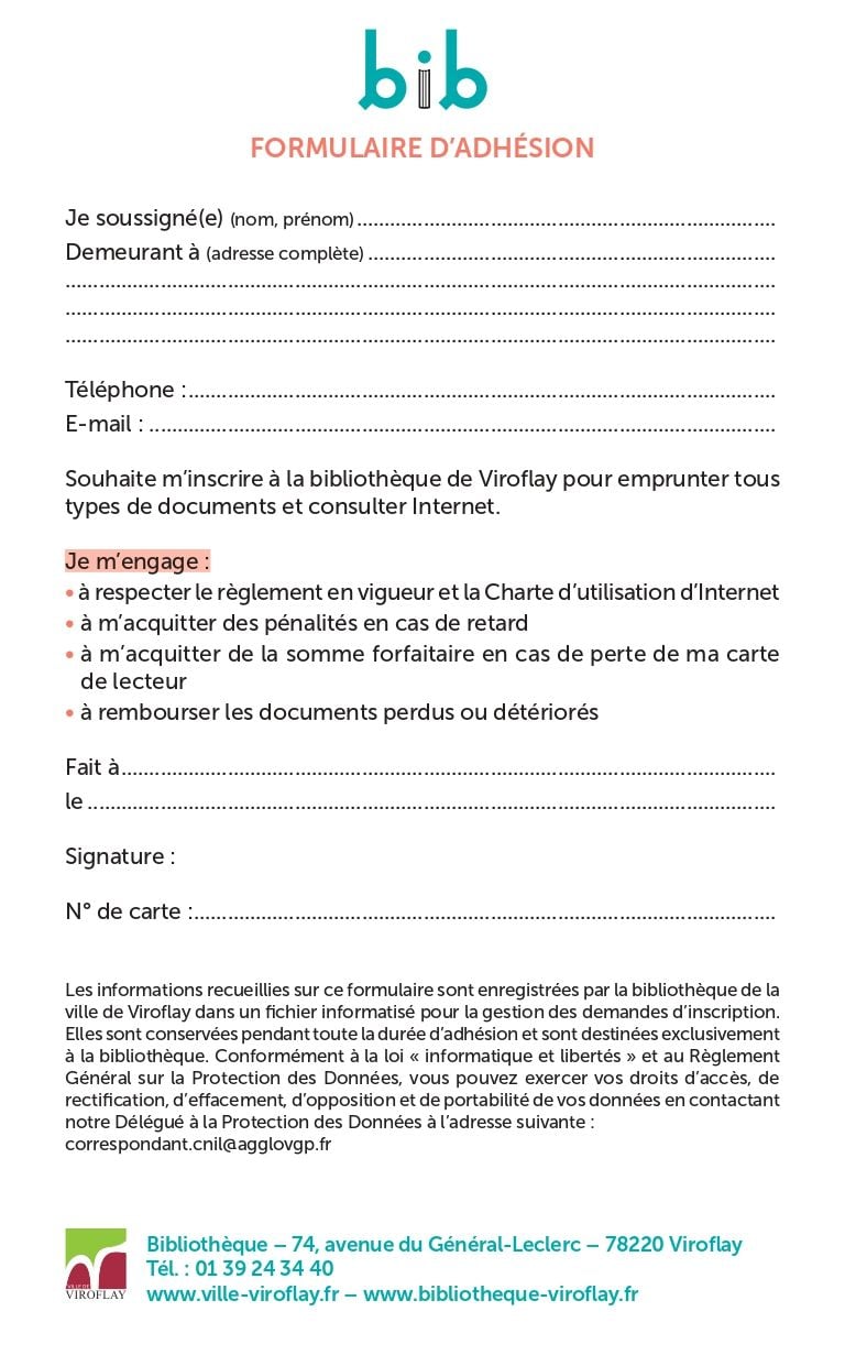 En cas de perte de la carte d’adhérent à la bibliothèque, une nouvelle carte pourra être délivrée sur présentation d’une pièce d’identité et en échange de 7 €.